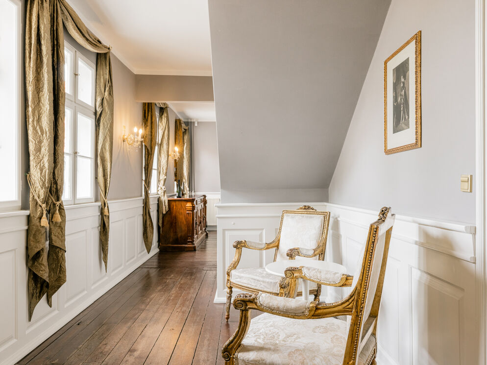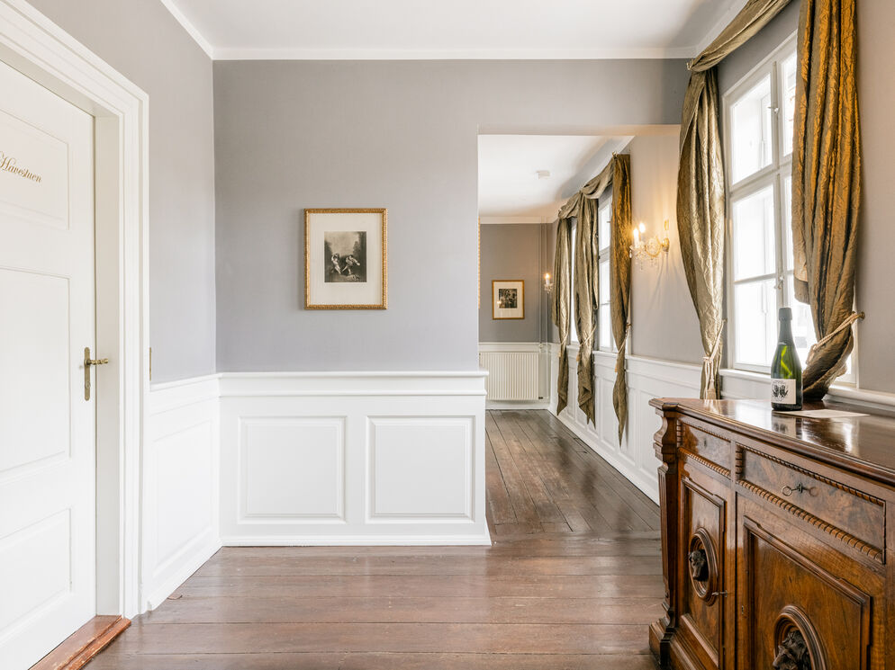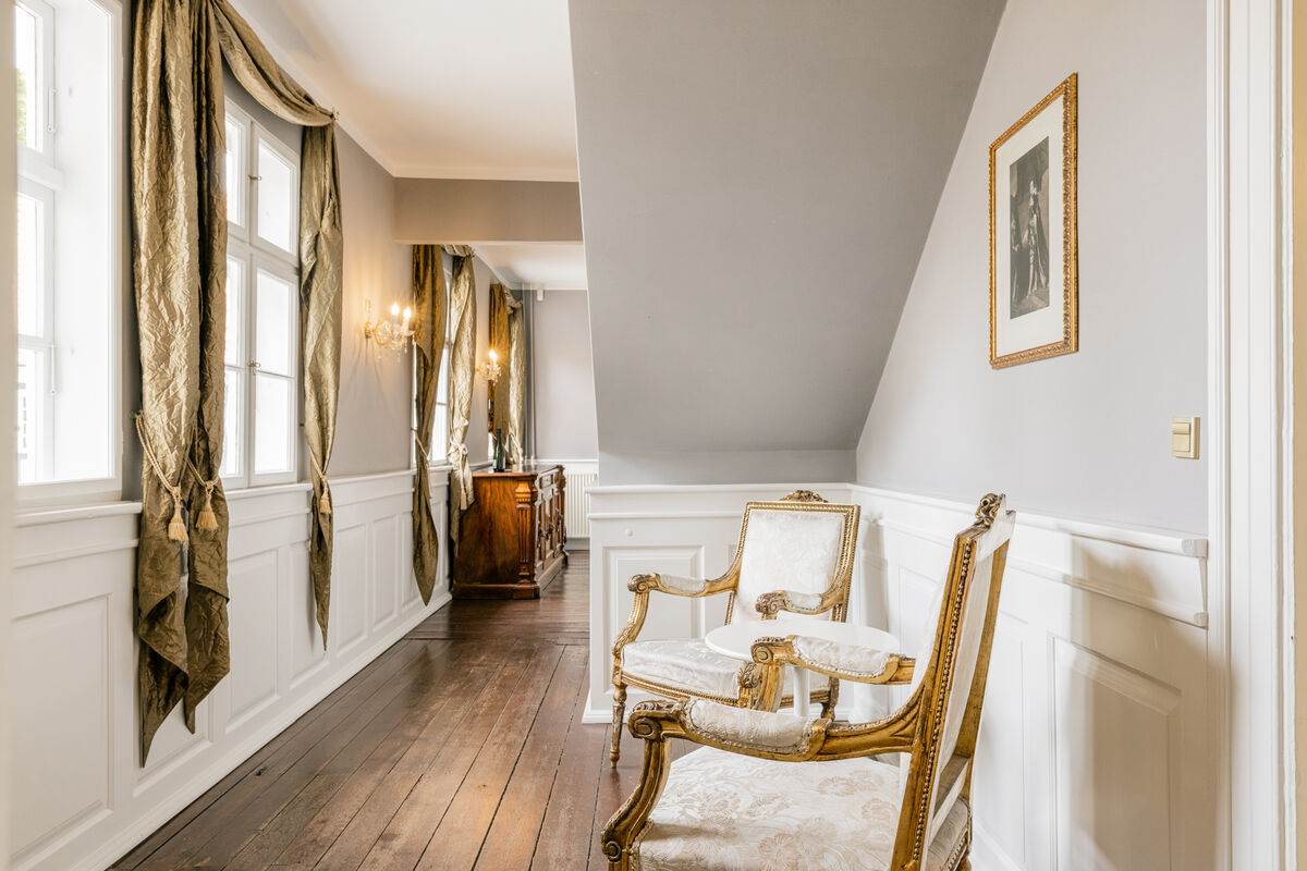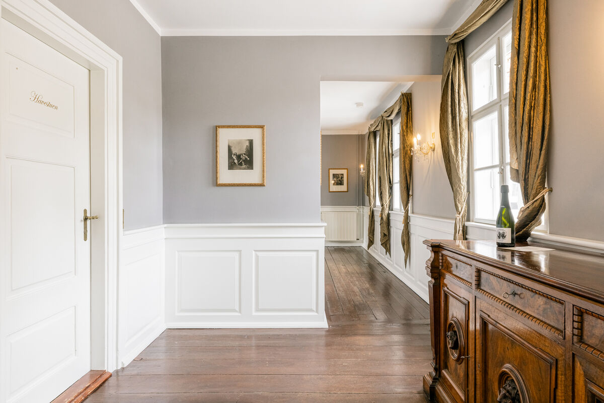 Once you have taken in the surrounding nature and the beautiful buildings, the experience continues inside the manor. Here awaits an interior that could be described as a consistent and complete ‘manor look’. Furniture, colours, and décor offer elegant solutions worthy of the beautiful building and its long history. This applies both to common areas and individual rooms. Everywhere, you sense the connectivity in design and, not least, respect for the manor. From the checkered floor in the kitchen to the rustic plank floors and furniture with Rococo and Empire touches. The details are many, beautiful, and inspiring, whether you are hosting a party or discussing business.