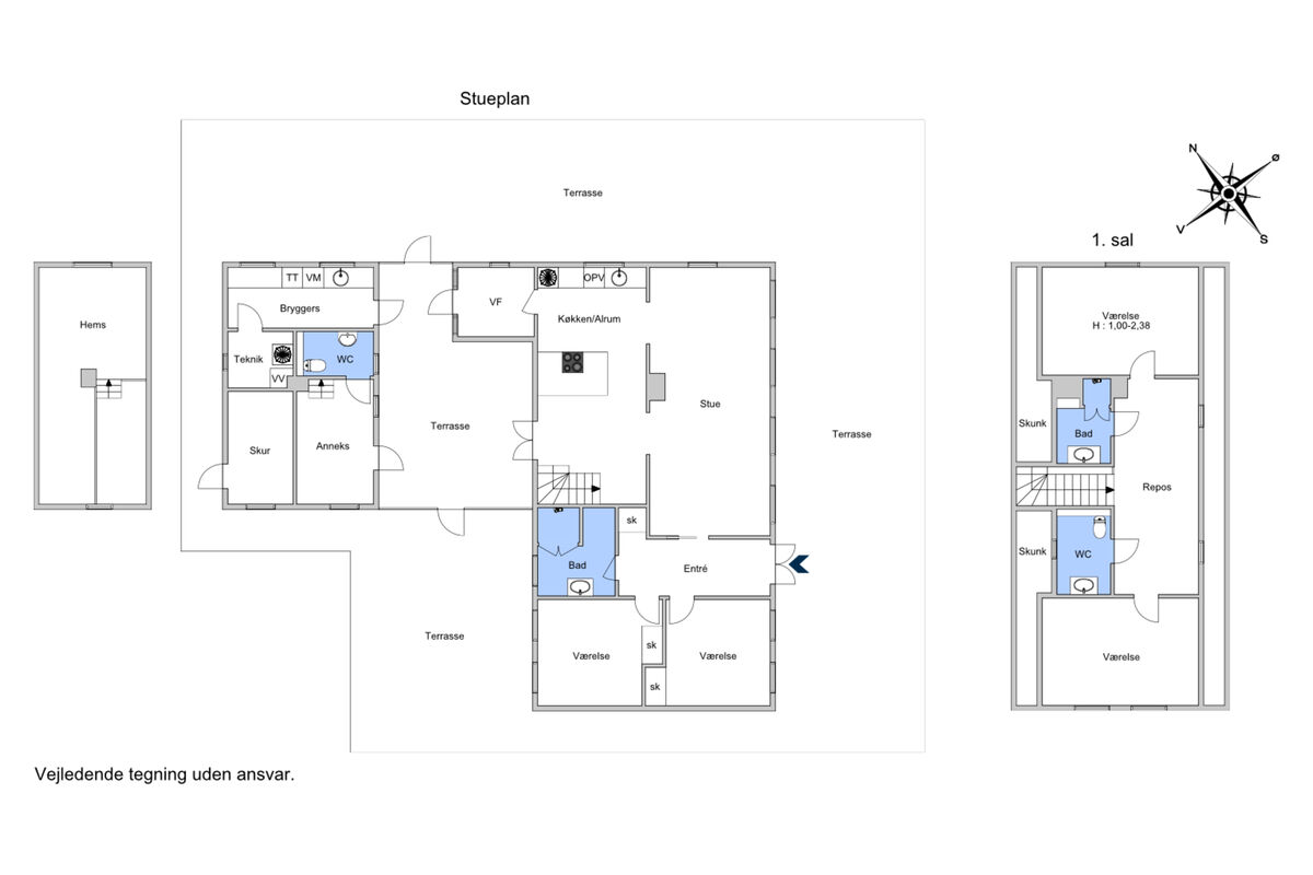 Huset indeholder 4 store flotte soveværelser samt et anneks med hems med plads til 2 personer, en stor åben stue med fantastisk udsigt og kun ca. 45 m til vandkanten.