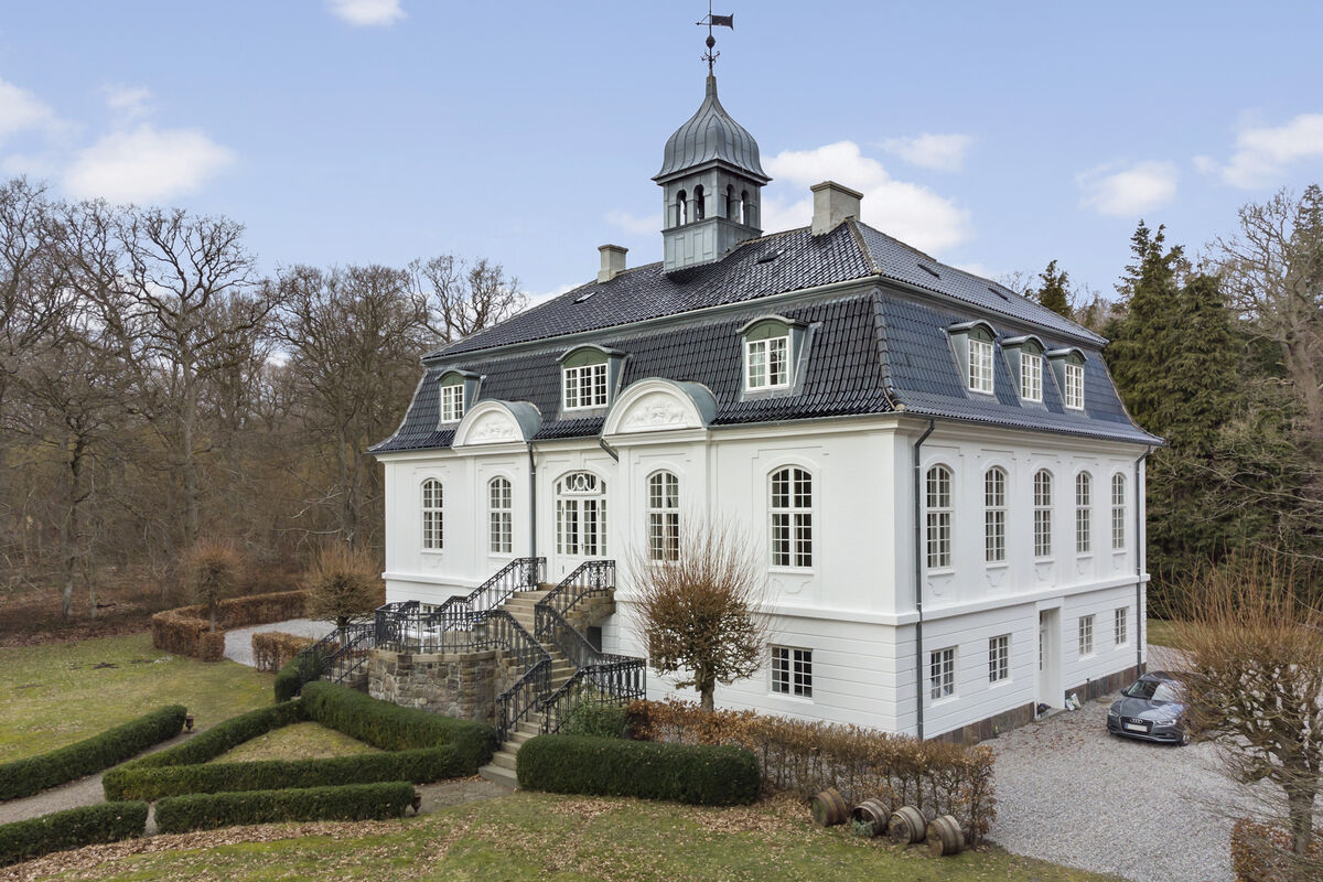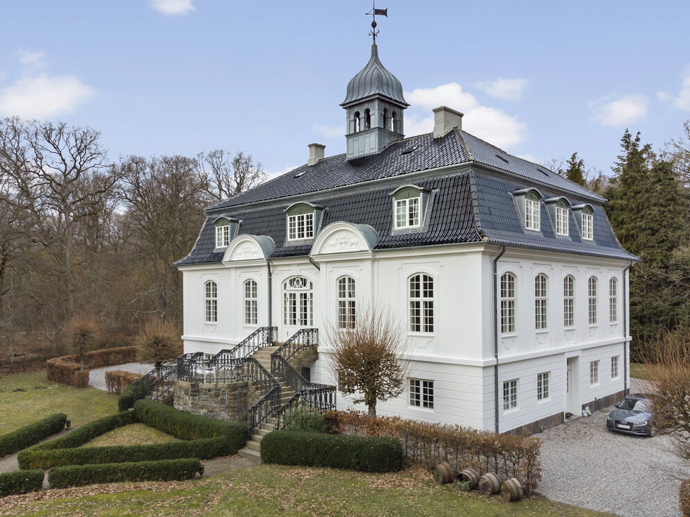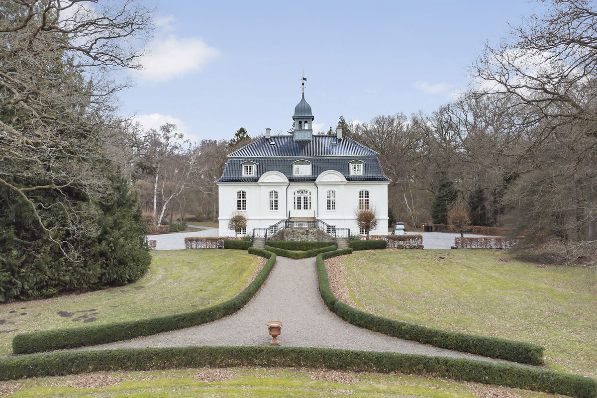 Det flotte hvide palæ med det sorte tegltag blev opført i 1910 i den småbladede Lindeskov – midt i det kuperede lollandske terræn. Bag ejendommen er der kun 600 meter til Østersøen, og Vindeholme ligger kun 175 kilometer fra København.